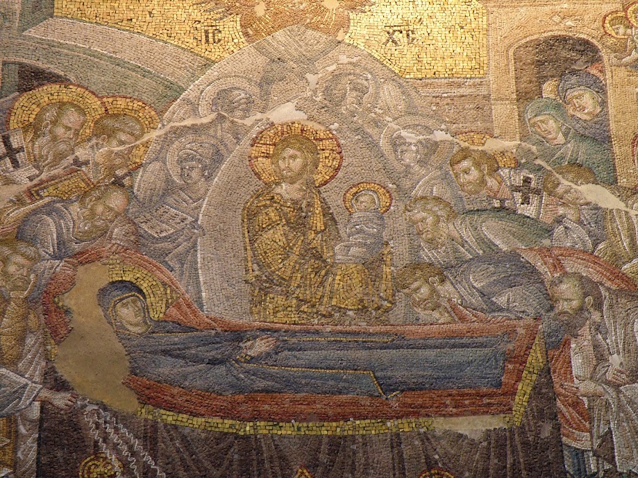 往上看到的拱形空間,以聖經的故事為劇本,覆蓋精緻工藝鑲嵌而成的壁畫,穿過空間的太陽光與馬賽克瓷磚共舞,讓耶穌與聖者在不同的角度下閃現出偶然的金光.